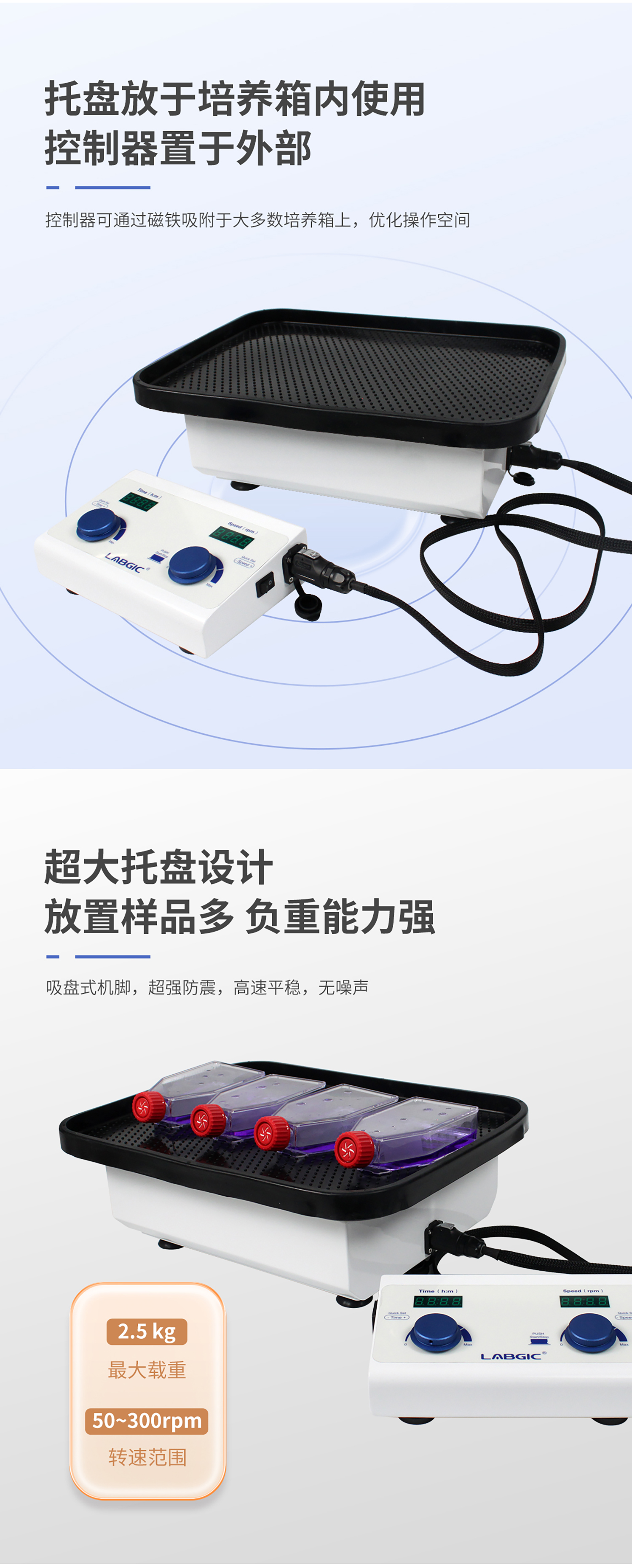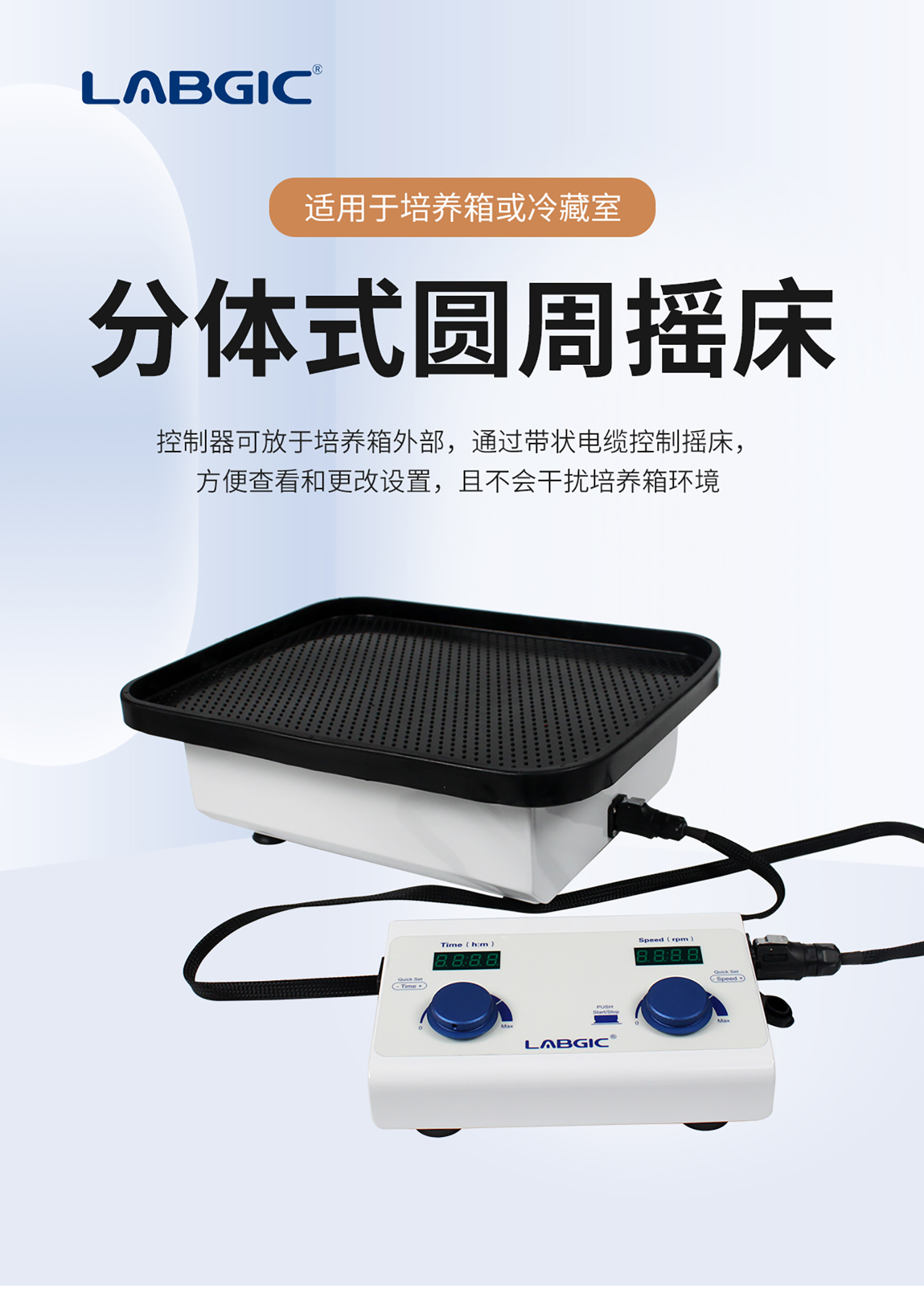 分体式圆周摇床适合用于二氧化碳培养箱,温室,冰箱内使用,参数显示和控制器置于外部,不用担心潮湿、高温等因素影响仪器性能与寿命,非常适合用于动物细胞培养、悬浮细胞培养和高低温化学反应。控制器可通过磁铁吸附于大多数培养箱上,优化操作空间。