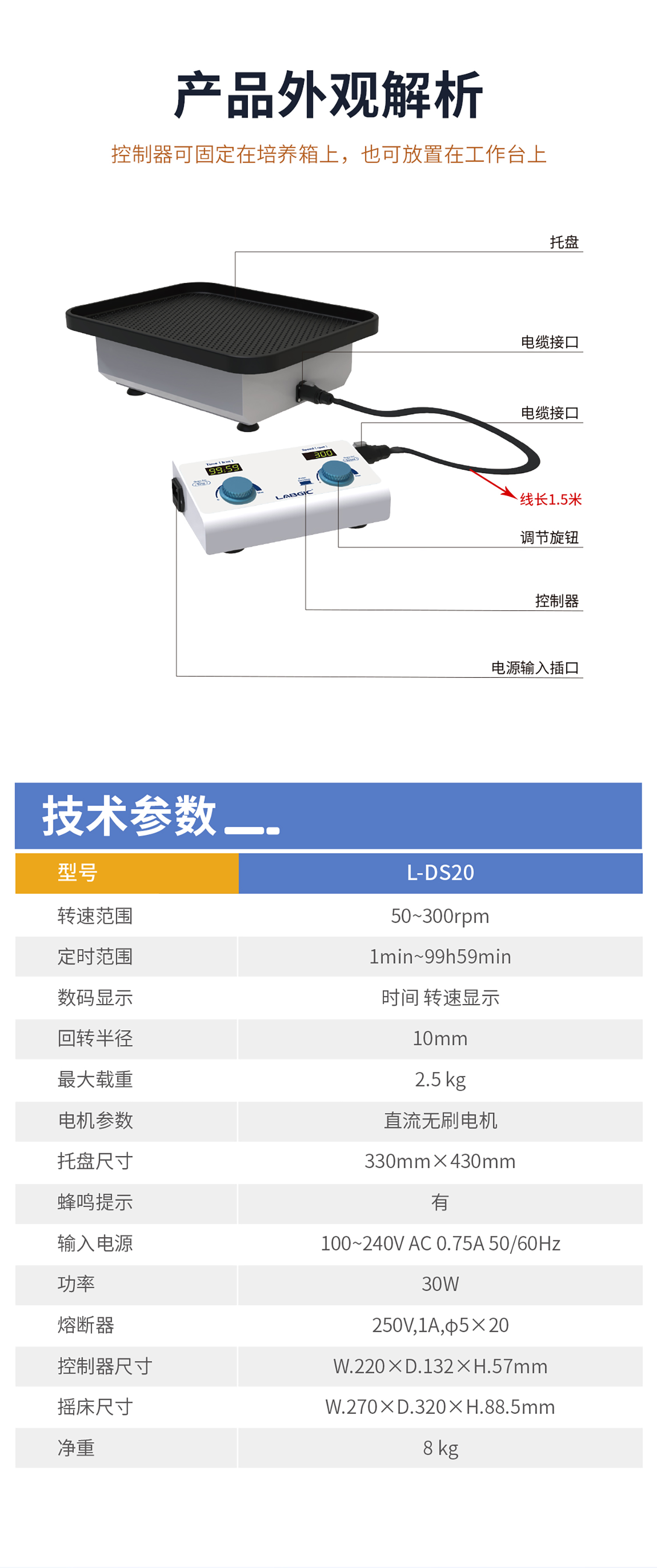 - 控制器可放于培养箱外部,通过带状电缆控制摇床,方便查看和更改设置,且不会干扰培养箱环境。