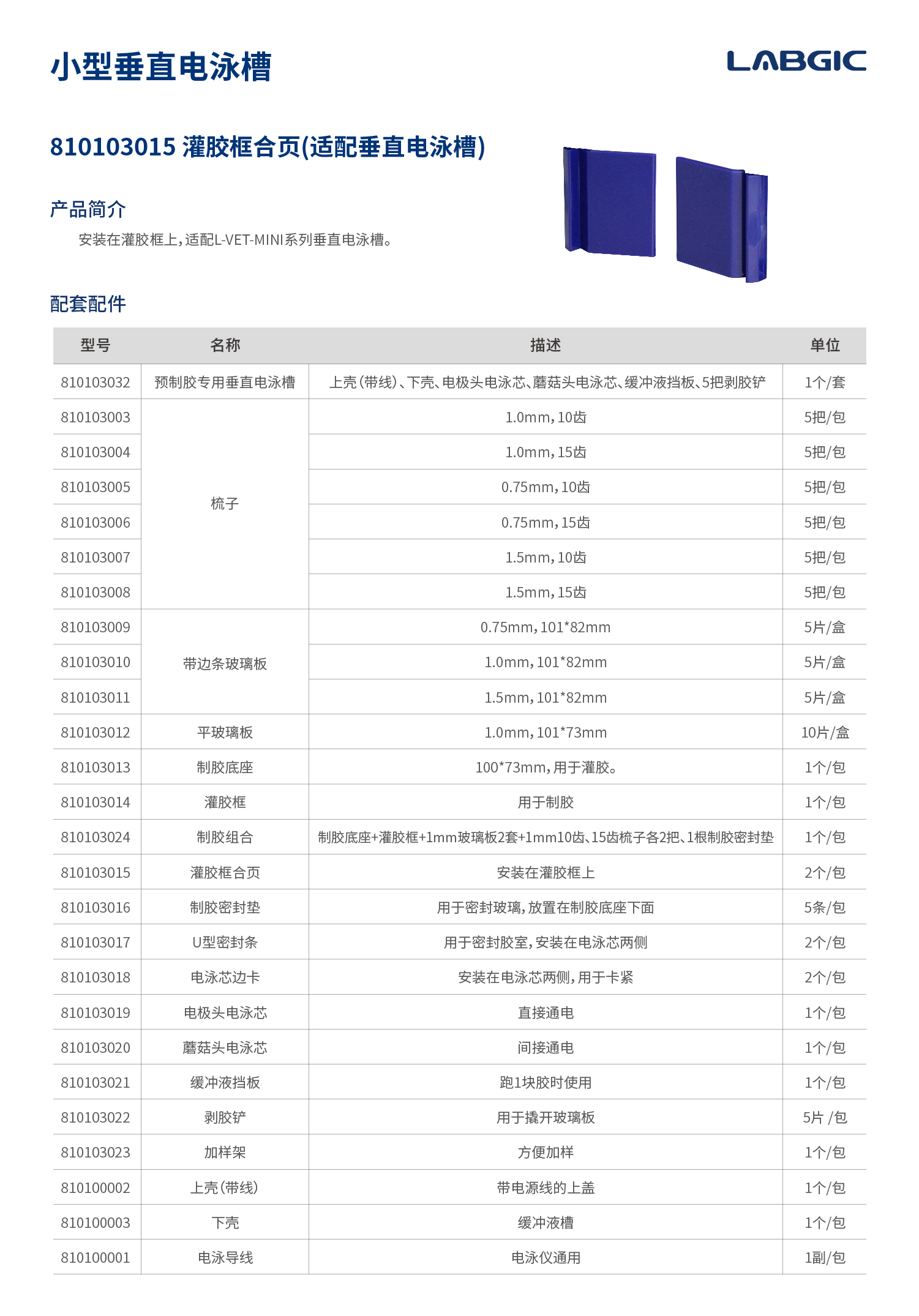 制胶底座+灌胶框+1mm玻璃板2套+1mm10齿、15齿梳子各2把、1根制胶密封垫。 |
