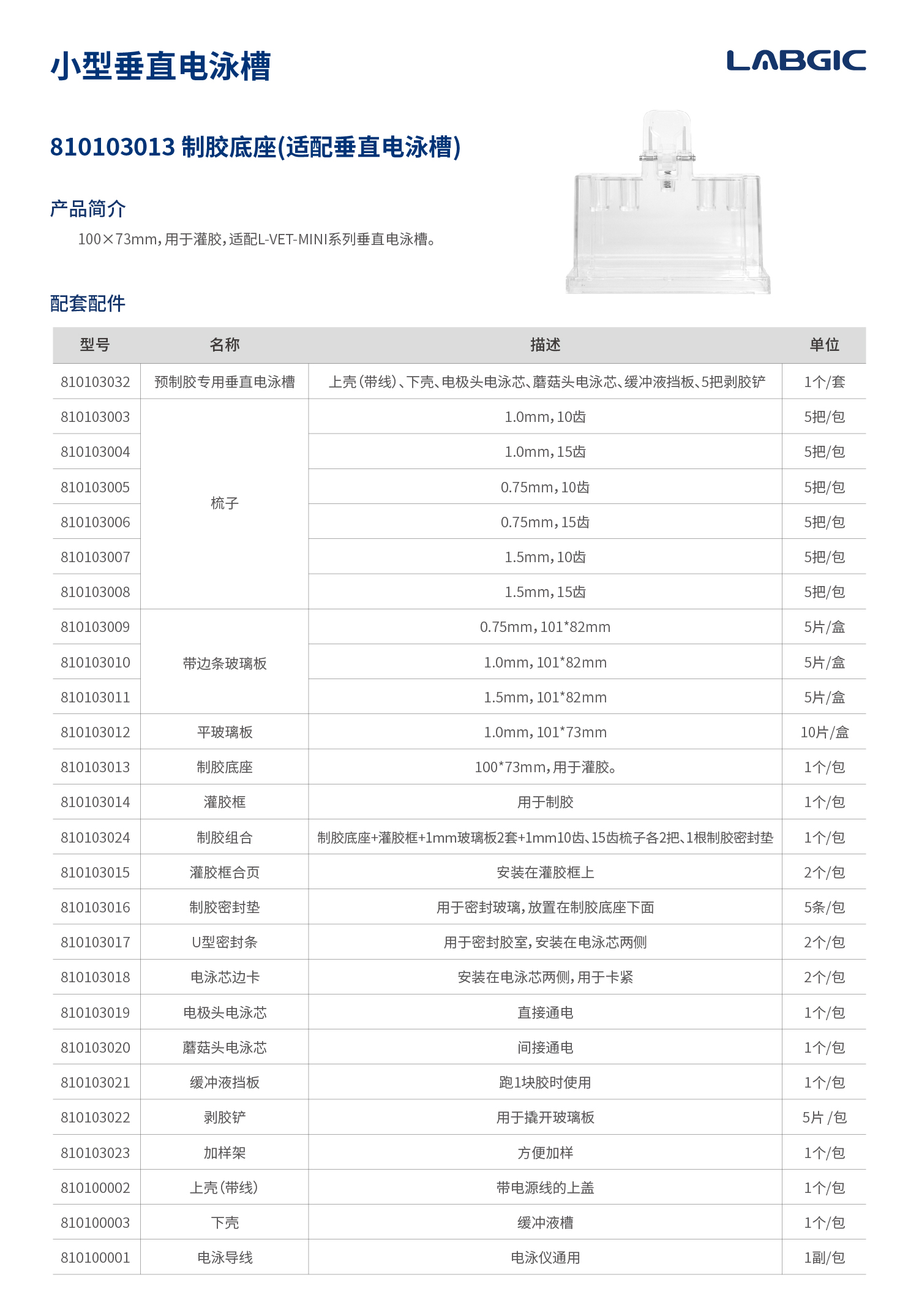 制胶底座+灌胶框+1mm玻璃板2套+1mm10齿、15齿梳子各2把、1根制胶密封垫。 |