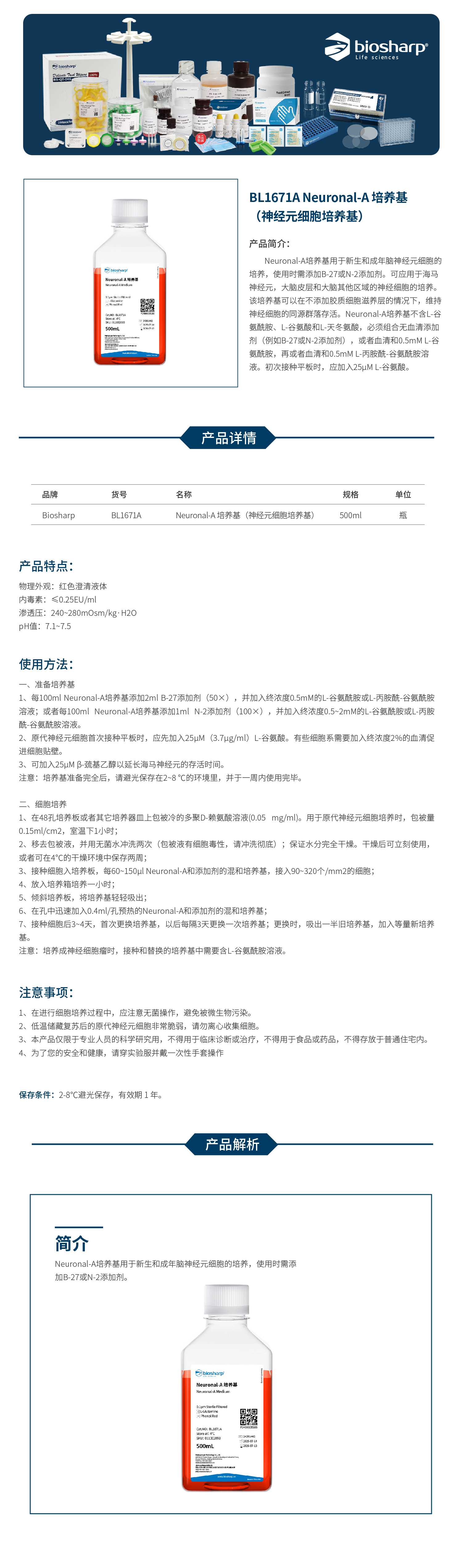 BL1671A Neuronal-A 培养基(神经元细胞培养基)